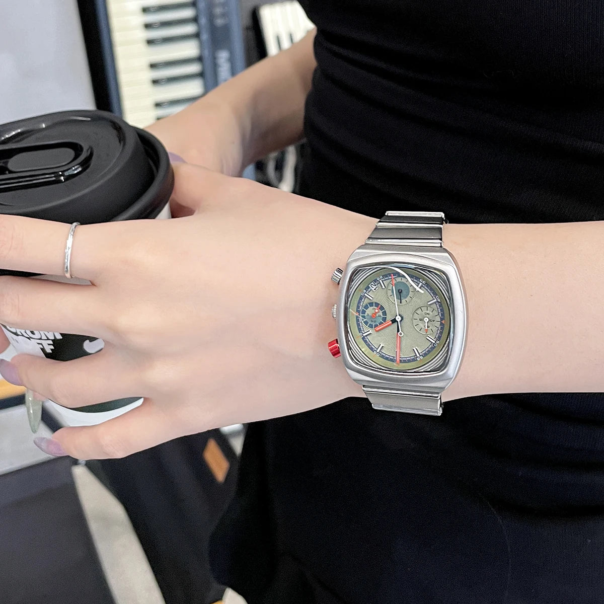 - Design moderne : Cadran carré, affichage épuré sans chiffres, style sobre et masculin.