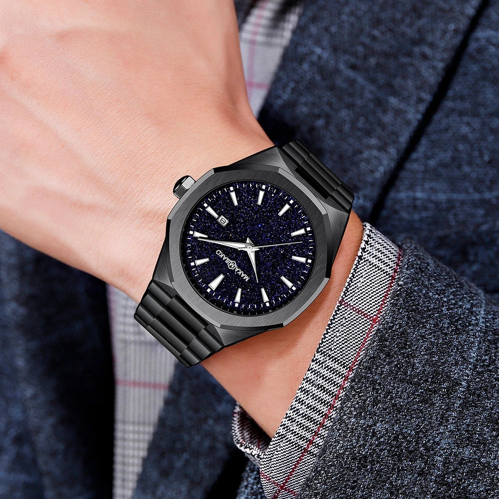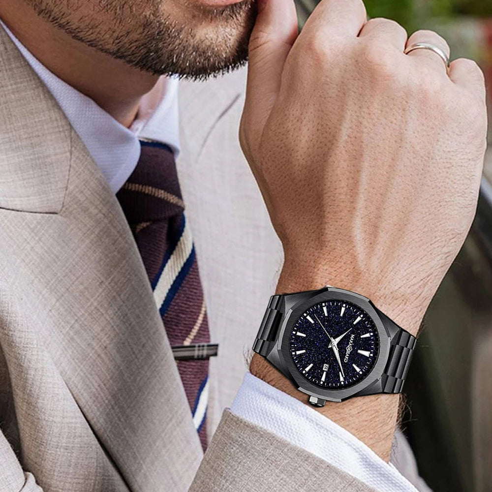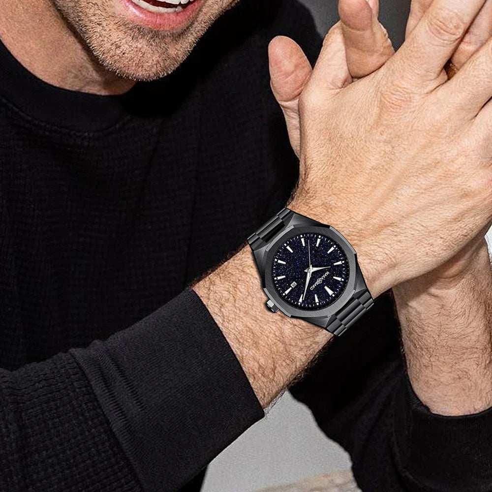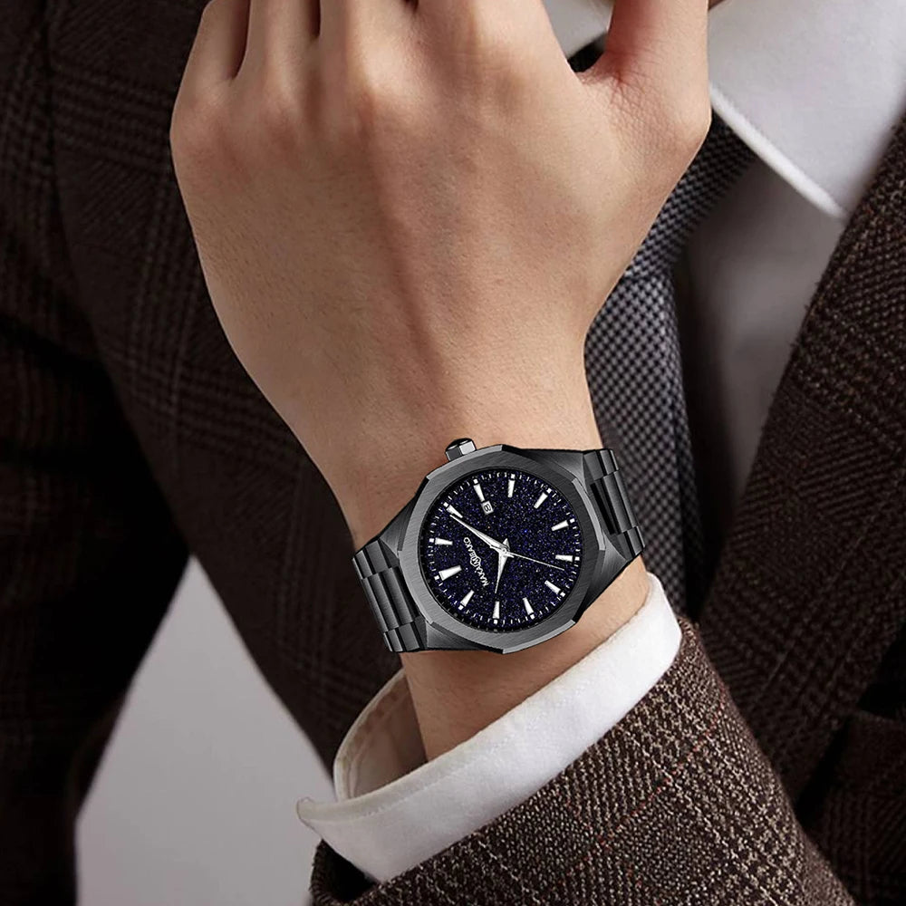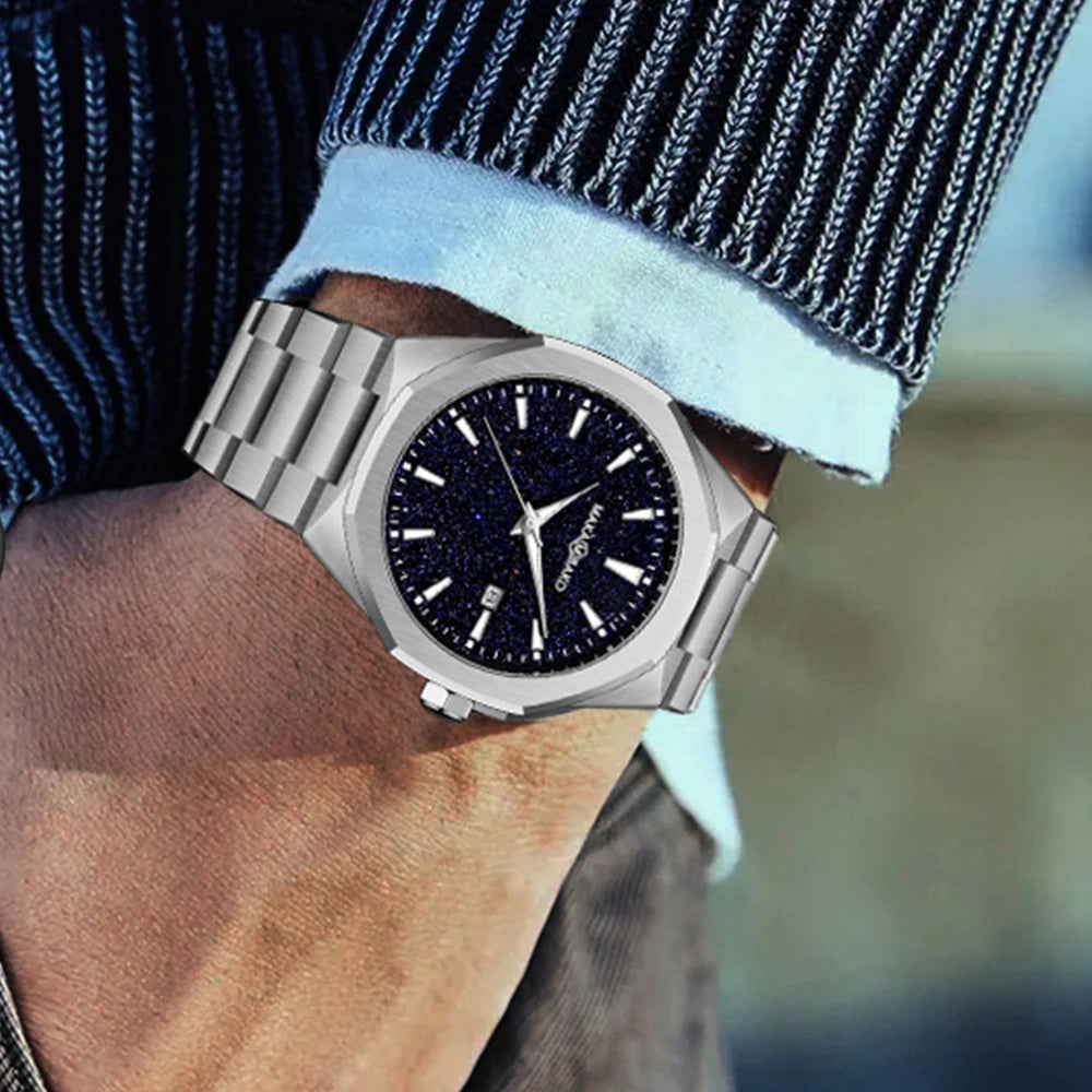 Construction en Acier Inoxydable : Le bracelet en acier inoxydable et le boîtier en alliage dégagent durabilité et élégance, ce qui rend cette montre adaptée aussi bien aux occasions formelles qu'au port quotidien. La boucle déployante avec sécurité assure un ajustement sécurisé sur votre poignet.