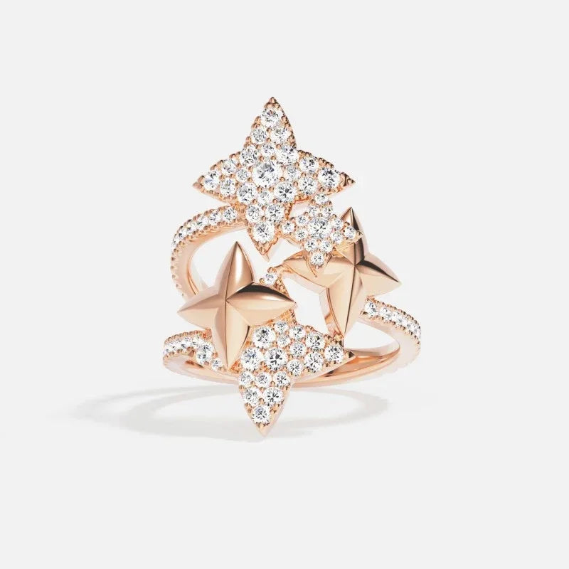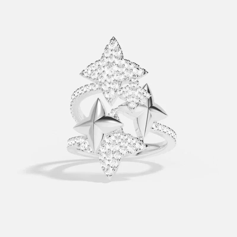 Conçue pour capturer la lumière sous tous les angles, cette création sublime associe plusieurs étoiles serties de cristaux étincelants à une monture raffinée, ornée de détails scintillants.