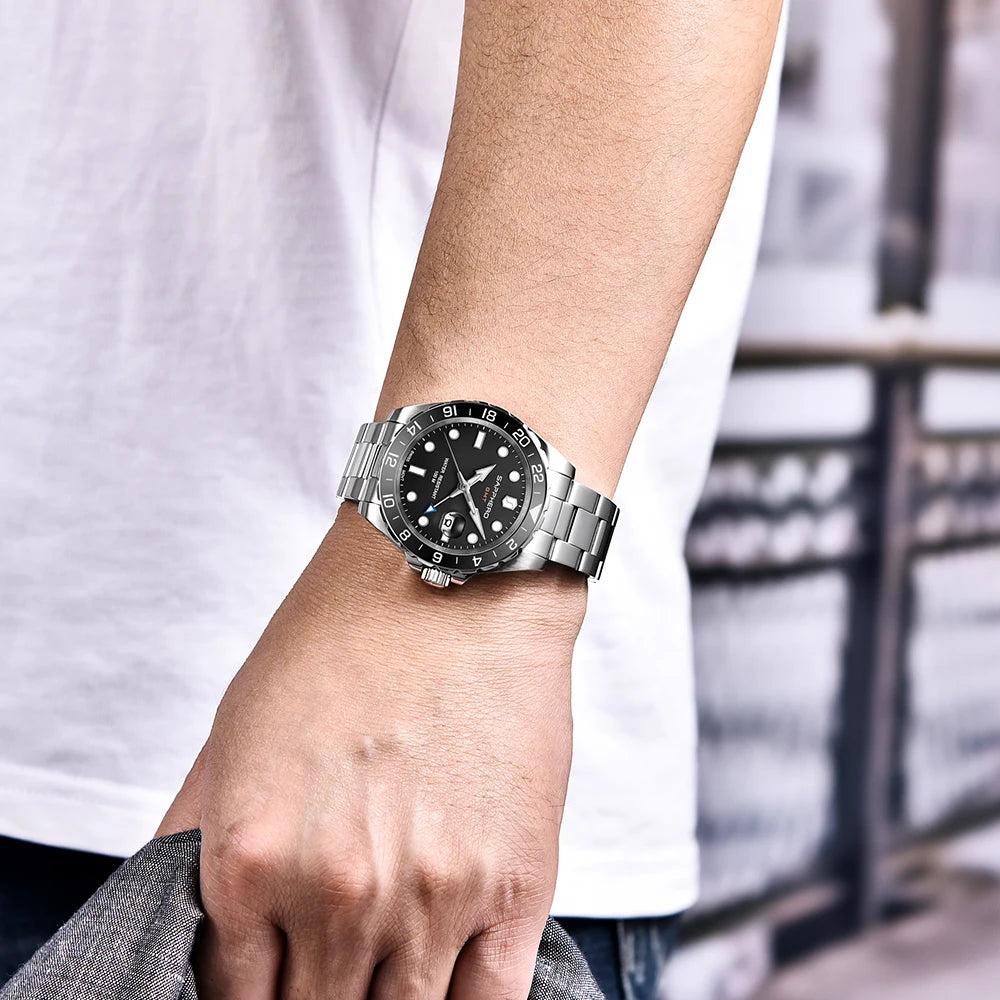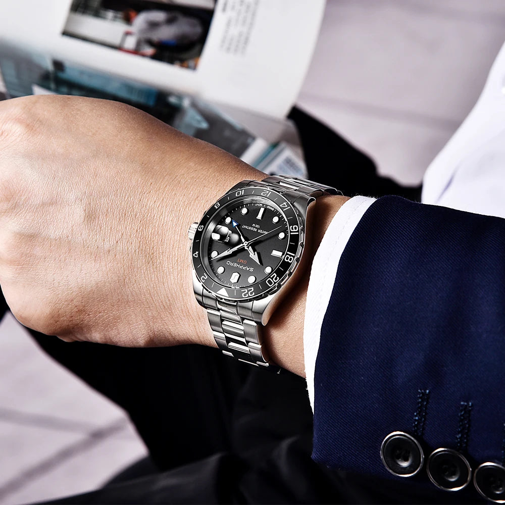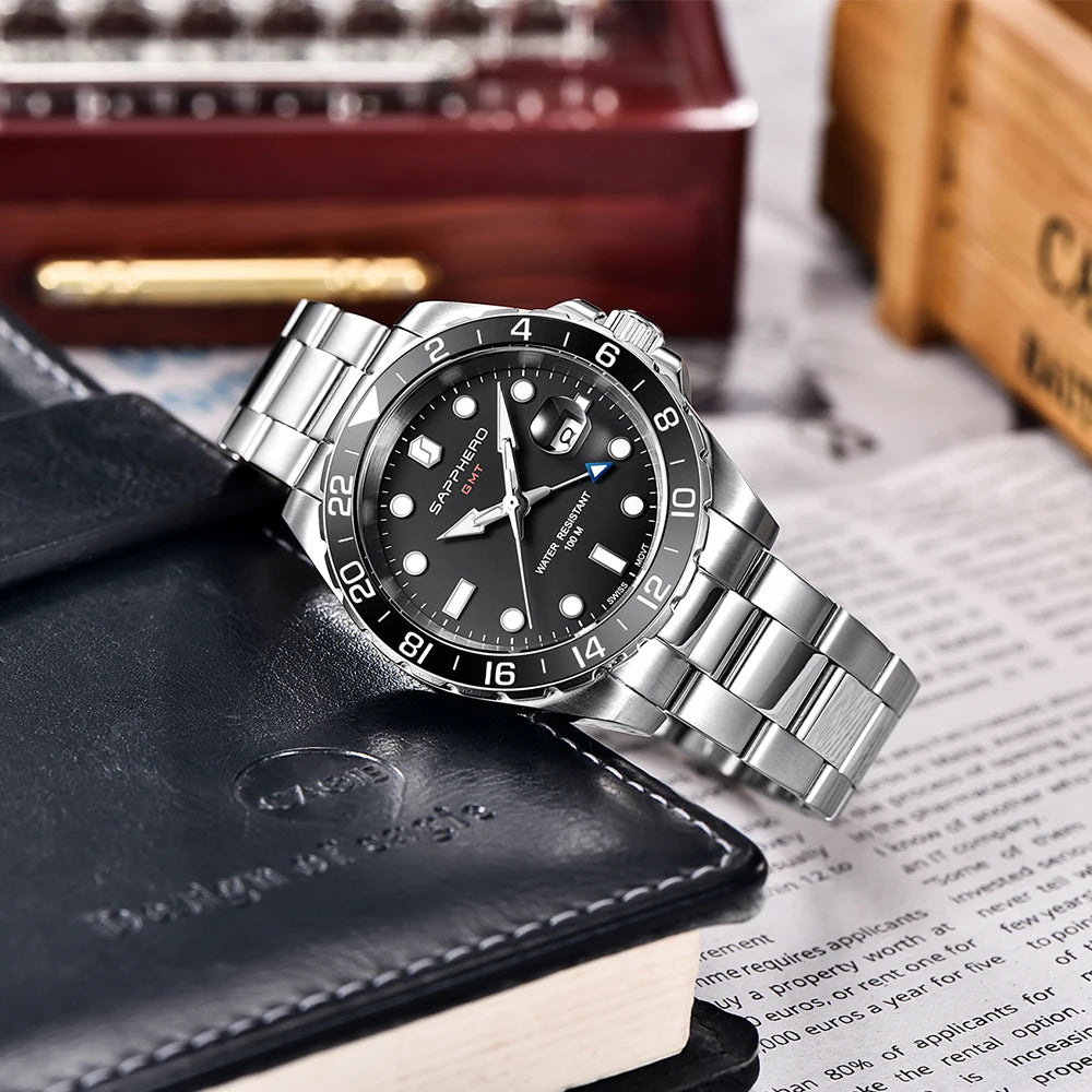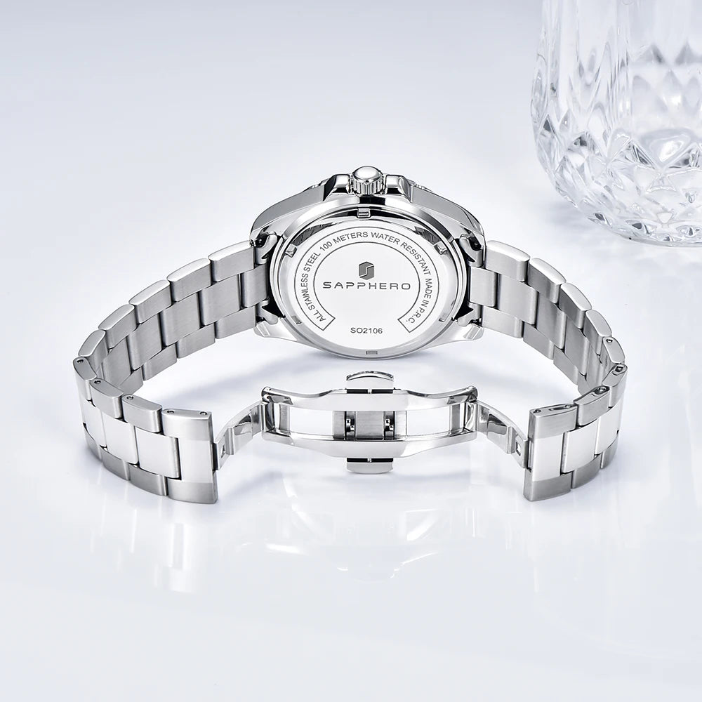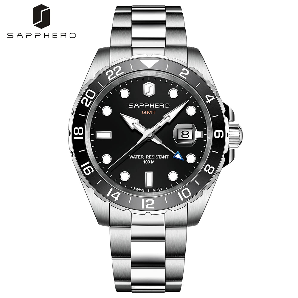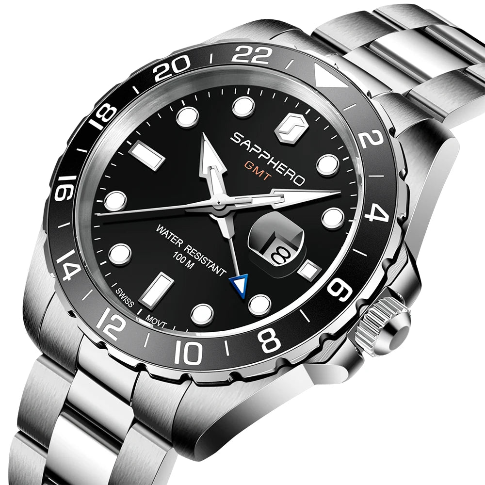 La montre SO-2106 de SAPPHERO incarne l'élégance intemporelle et la fonctionnalité supérieure, avec un design soigné et des caractéristiques exceptionnelles. Dotée d'un mouvement GMT suisse de haute qualité, cette montre offre une précision inégalée pour vous garder à l'heure où que vous soyez dans le monde.